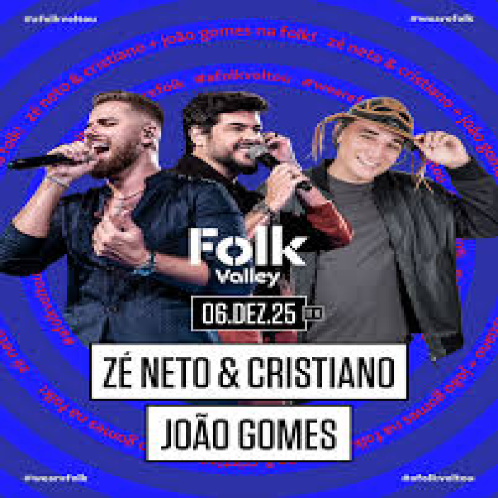 Folk Valley Apresenta: Zé Neto & Cristiano e João Gomes dezembro 6, 2025 05:00 PM A Folk Valley recebe a dupla sertaneja Zé Neto & Cristiano e o fenômeno do forró/piseiro João Gomes para uma noite inesquecível de música e energia em Valinhos, SP.